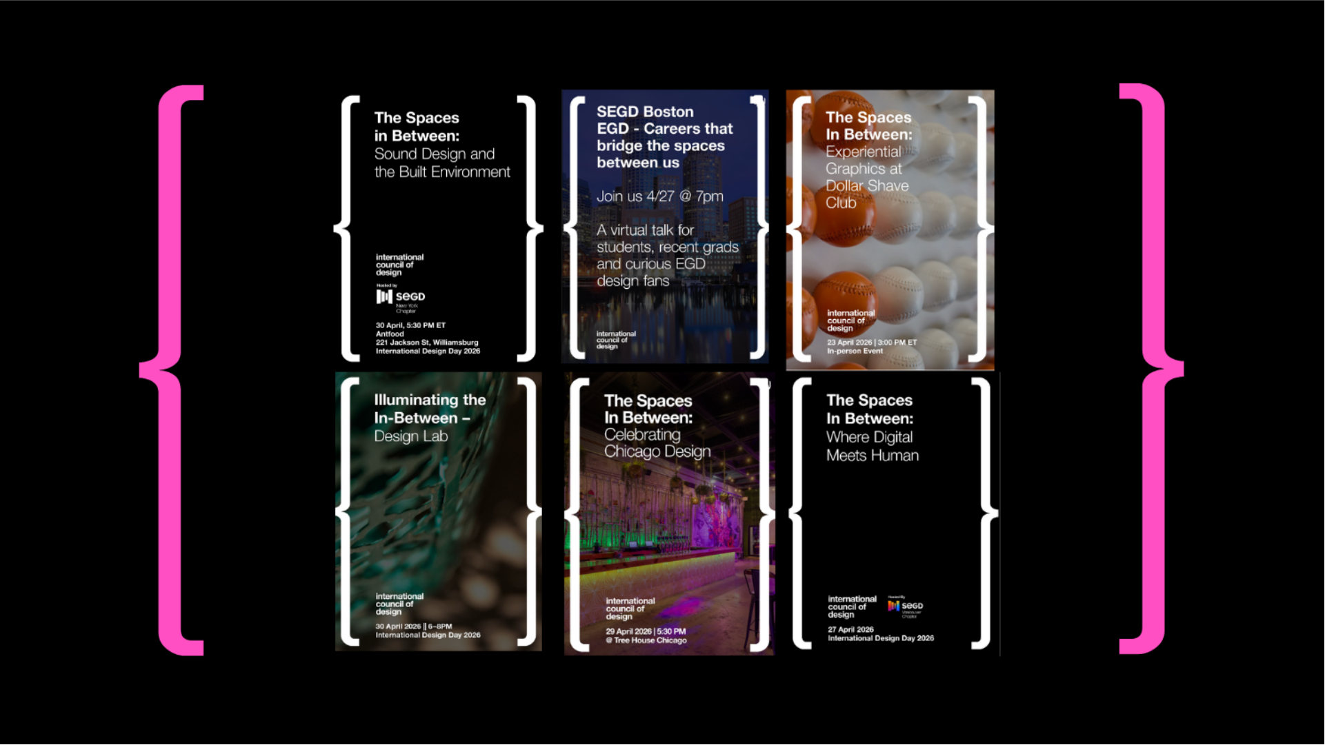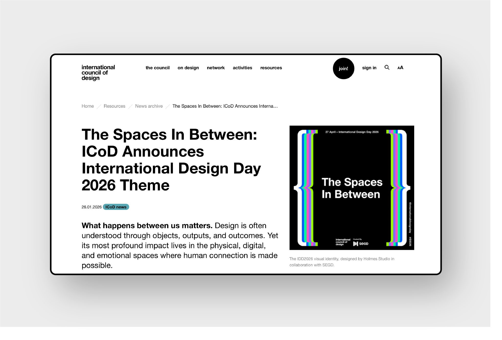 In late 2025, Holmes Studio were appointed to create the visual identity for International Design Day 2026 (IDD2026) and its central concept, The Spaces in Between. Selected by this year’s host organisation, the Society for Experiential Graphic Design (SEGD), we were tasked with creating a bold, striking and flexible design that could work across a range of social media formats and materials.